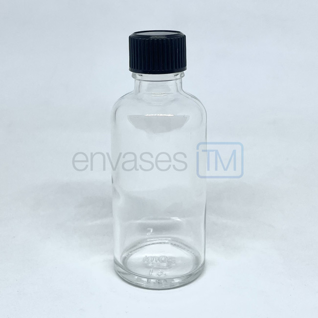 Botella de 50 ml. vidrio transparente con tapa color negra.