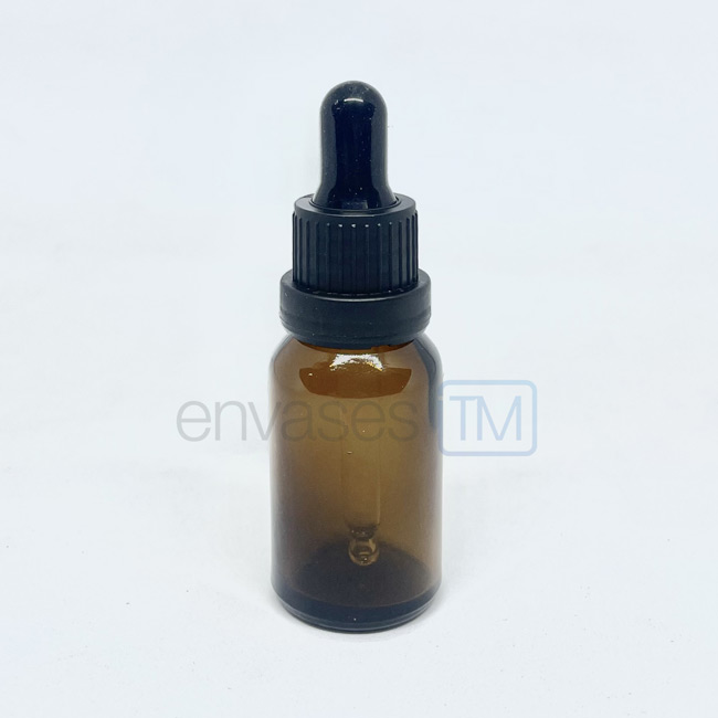 Envase gotario de 15ml color ámbar con pipeta negra de seguridad.