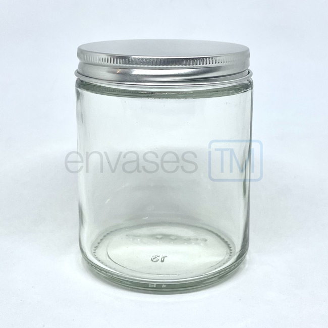 Pote de 220 ml. vidrio transparente con tapa plateada.